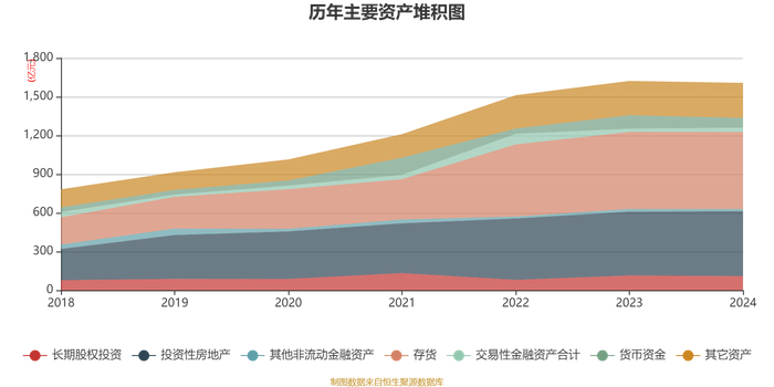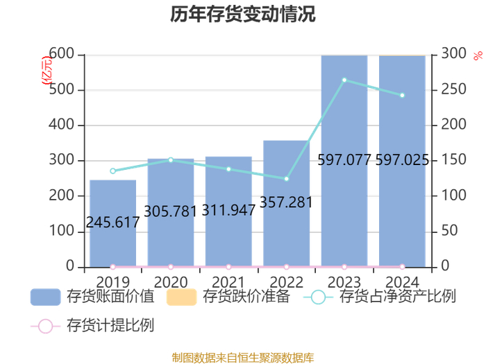 从存货变动来看,截至2024年末,公司存货账面价值为597.03亿元,占净资产的242.5%,较上年末减少513.57万元。其中,存货跌价准备为1.86亿元,计提比例为0.31%。