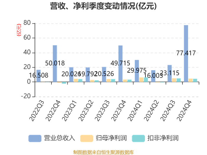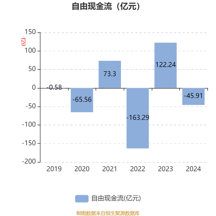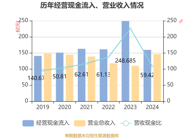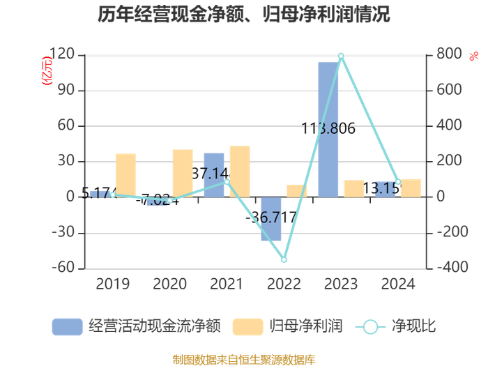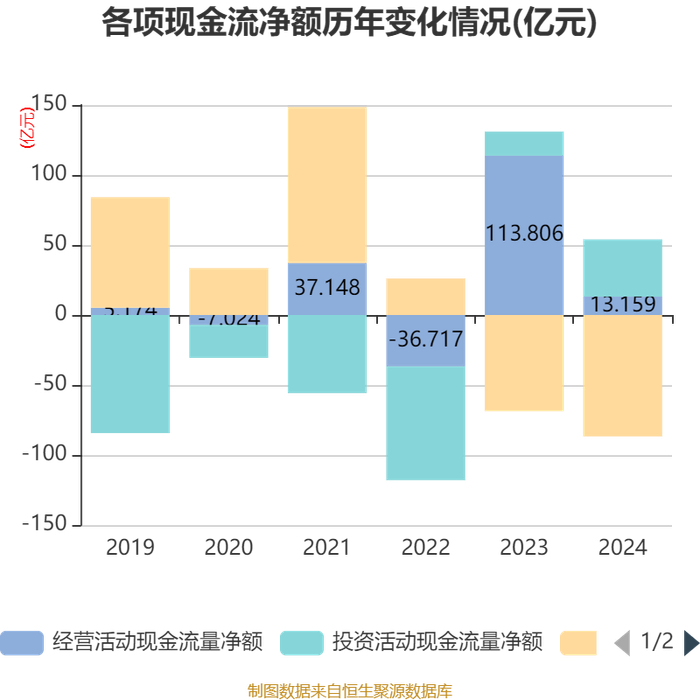 截至2024年,公司经营活动现金流净额为13.16亿元,同比下降88.44%;筹资活动现金流净额-86.7亿元,同比减少17.96亿元;投资活动现金流净额40.81亿元,上年同期为17.16亿元。
