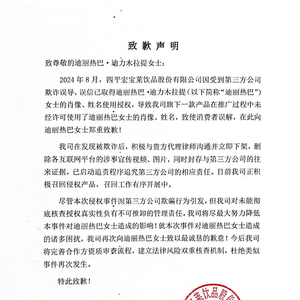 新京报讯(记者王子扬)4月22日,新京报记者从饮料企业四平宏宝莱饮品股份有限公司(简称“宏宝莱”)官网了解到,该公司因未经许可使用艺人迪丽热巴·迪力木拉提(简称“迪丽热巴”)肖像、姓名进行推广发布致歉声明。宏宝莱称,发现侵权后,第一时间下架并删除了相关宣传信息。