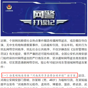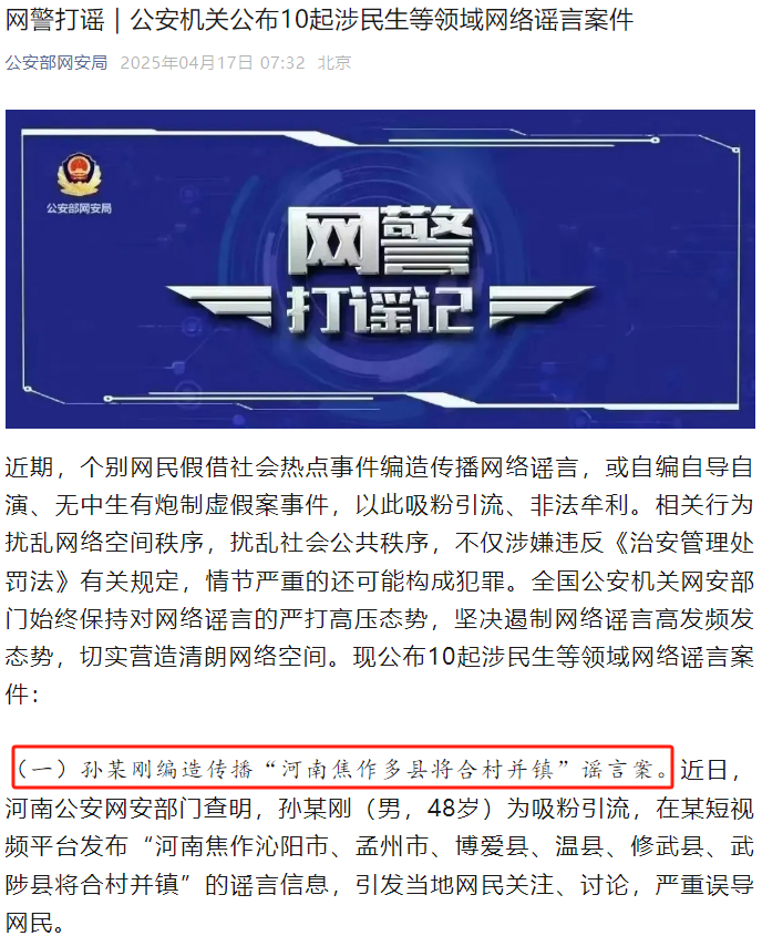 编造“河南焦作多县将合村并镇”的网民被依法处罚
