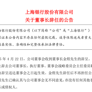 上海银行当天下午发布公告,公司董事会收到金煜因年龄原因辞去公司董事长、执行董事、董事会战略委员会主任委员职务。