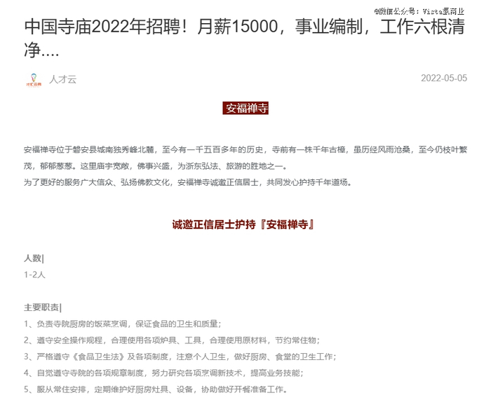 15000元一个月。一些寺庙在招聘里写明,厨师需要有三年以上经验,以及做大锅饭、做素食的经验。有些规模较大的寺庙还会提供事业编制。