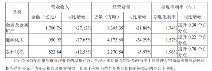 公司供应链管理业务核心品类的市场地位稳固,铁矿石、钢材、煤炭进口等核心品类经营货量稳居行业第一梯队,金属制品、非金属矿产、油品、化纤等产品经营货量实现较好增长。公司通过积极贯彻“三链融合”发展新模式,优化业务结构,调整风险偏好,聚焦高质量业务发展,合理运用期现结合策略,主要品类的期现毛利率改善明显,公司总体期现毛利率提升0.36个百分点至1.83%。