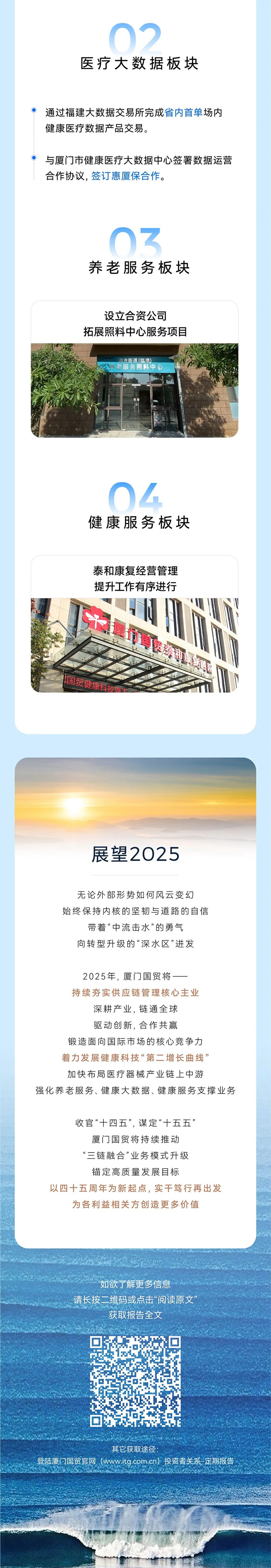 医疗器械业务以医疗器械的流通与服务为基础,积极布局医疗器械研发、生产、销售三位一 体业务体系,打造医疗器械科技平台企业。养老服务业务主要开展医、养、康、护等一体化服务。 公司作为厦门市政府唯一授权的健康医疗大数据运营单位,构建面向政府、医院、居民和企业的 医疗大数据技术平台和应用生态。健康服务业务着力运营康复医院。公司通过产业并购推进大健 康产业外延式发展。