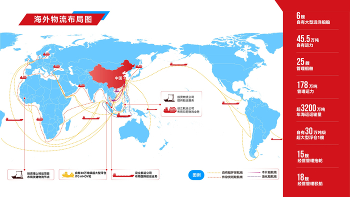 现有自管仓库面积约120 万平方米、合作仓库超2,000 个,配送网络覆盖国内沿海及内陆主要区域。公司现自有大型远洋船舶6 艘、自有运力45.5 万吨,管理船舶25 艘、管理运力178 万吨,年海运运输量超3,200 万吨。公司在印尼、新加坡、几内亚等地投资布局关键物流资产,自有30万吨级超大型浮仓1 艘,经营管理拖轮15 艘、驳船18 艘,持续加强国际物流服务能力。
