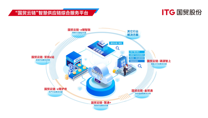 公司立足供应链场景,自主构建智慧供应链综合服务平台——国贸云链,提供适用于各类大宗商品供应链的行业解决方案,涵盖了针对纸业、金属、农产、能源、石化等多个大宗商品行业的供应链业务数字化平台、针对供应链风控场景的“国贸云链·天眼”、针对电子签章应用场景的“国贸云链·智签”、针对供应链金融服务场景的“国贸云链 ·金贸通”、针对供应链综合物流仓储服务场景的“国贸云链 ·慧通+”、针对供应链业务敞口风险数字化管理场景的大宗商品贸易期现管理系统等,为产业伙伴提供更高效优质的综合服务。