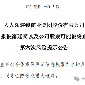 同时,人人乐还发布了股票可能被终止上市的第六次风险提示公告。截至目前,人人乐可能触及两个财务类终止上市情形:一是连续两个年度经审计的期末净资产为负值,二是年报可能被出具非标审计意见。根据《深圳证券交易所股票上市规则》第9.3.12条规定,如果以上情形之一成立,深交所将终止其股票上市交易。