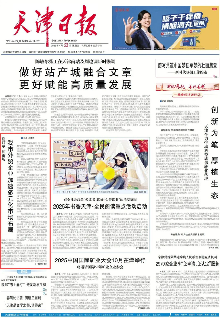 稳住外贸基本盘,政府部门在行动。市商务局相关负责人表示,为帮助企业开拓多元化国际市场,市商务局印发境内外重点展会名录,进一步加大了对企业参展的支持力度。与此同时,积极促进跨境电商发展,鼓励企业通过海外品牌培育、布局自建站等方式把控终端销售渠道和价格,支持企业在中东、中亚、非洲等新兴市场布局公共海外仓。此外,商务部门还将会同中国进出口银行天津分行、国家开发银行天津分行用好融资专项政策,为企业拓展共建“一带一路”国家出口渠道提供助力。
