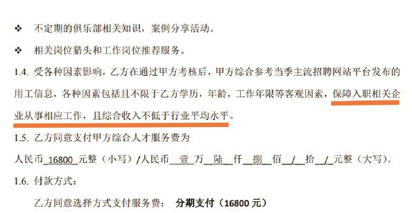 在培训协议中,记者注意到,甲方有义务向乙方提供就业保障服务,“保障入职相关企业从事相应工作,且综合收入不低于行业平均水平”,但未约定履约时限
