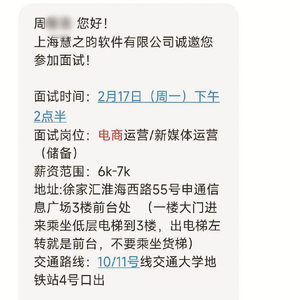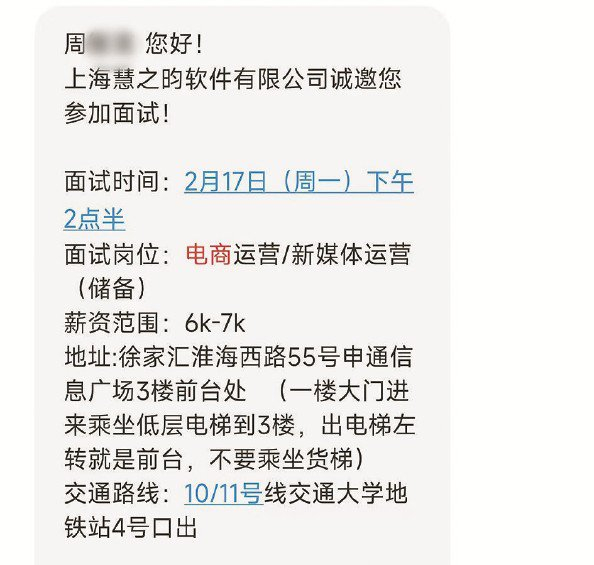 周先生接受这一工作岗位,由于没有电商运营经验,愿意接受相关培训。很快,他就收到了“上海慧之昀软件有限公司诚邀您参加面试”的短信通知,通知称,面试时间是2月17日下午,面试岗位为“电商运营/新媒体运营(储备)”,面试地址位于徐汇区淮海西路55号申通信息广场。