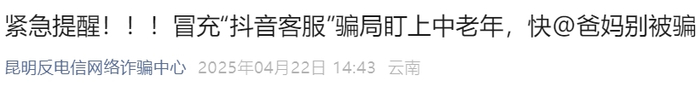 紧急提醒!冒充“抖音客服”骗局盯上中老年,快@爸妈别被骗