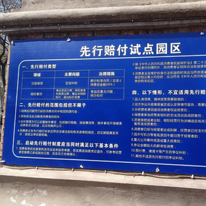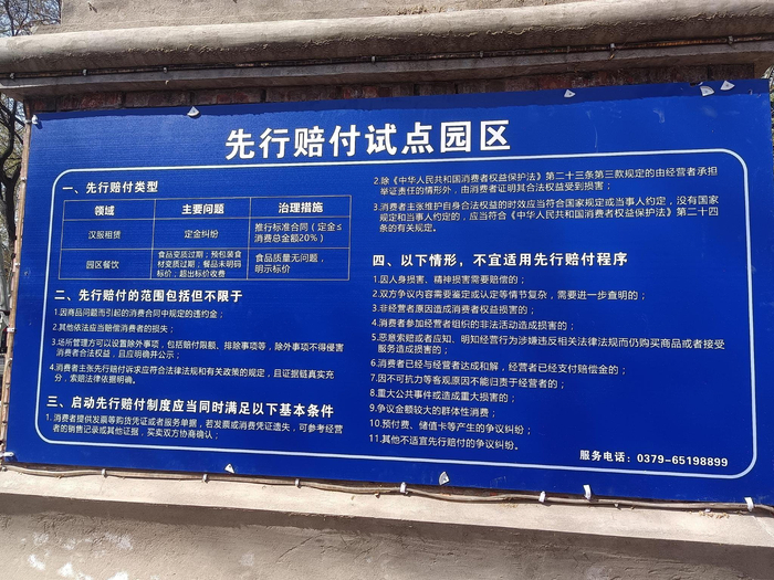 在洛阳市龙门古街的入口处,一块“洛阳市先行赔付试点单位”的立牌格外引人注目,上面标注有先行赔付方案、先行赔付承诺书等内容。