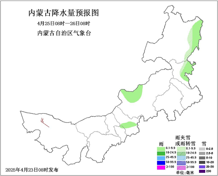 据“内蒙古天气”发布的消息,4月25日8时至26日8时,内蒙古中部偏北和东部偏东地区多云间晴,呼和浩特市东北部、乌兰察布市西南部部分地区、锡林郭勒盟西北部、兴安盟东部、呼伦贝尔市东部有分散性小雨或雨夹雪,其余地区晴间多云;西部偏北、中部偏西北和偏东、东部地区4、5级短时6、7级局地8级西北风;西部偏北地区气温下降4~6℃。