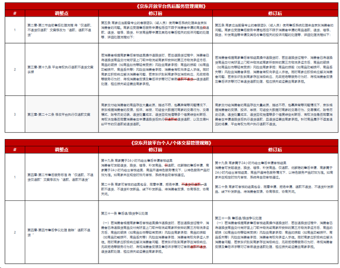京东在售后规则中,去掉了“仅退款”“退款不退货”等类似表述,京东表示,修订退货、退款场景下的处置规则,意在切实保障消费者权益及商家自主经营,进一步优化消费者与商家自主协商解决问题中的责任分配。