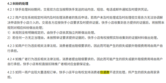 快手电商写道,为切实保护平台内商家和消费者权益,优化各方责任分配,进一步保障商家自主经营权,平台在最大化支持商家与消费者通过自主协商方式解决相关售后问题的同时,对相关退货退款情形的处置规则予以进一步明确。