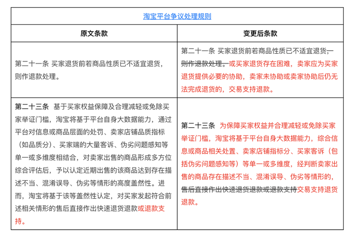 在修订中,淘宝缩小的了“作退款处理”的情形范围,尽可能地实现退货退款。