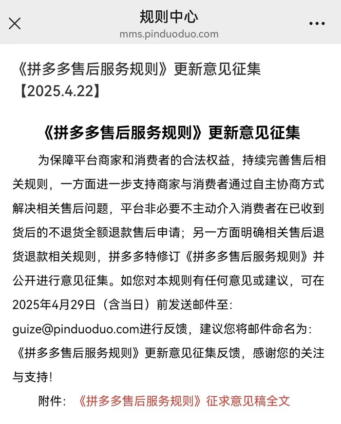 同日,拼多多发布《拼多多售后服务规则》更新意见征集。公告提到,平台将进一步支持商家与消费者通过自主协商方式解决相关售后问题,平台非必要不主动介入消费者在已收到货后的不退货全额退款售后申请。就修改后的《拼多多售后服务规则》,该平台向社会公开征求意见。