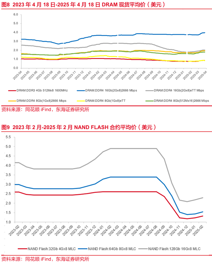 (1)存储芯片价格自2023年下半年以来小幅度反弹,但自2024年9月起,DRAM现货价格略有承压,部分DRAM细分产品价格自2025年2月中旬开始有所回升,NAND Flash合约价格在大幅下滑后于2025年1月有所回升,2月延续上行走势。