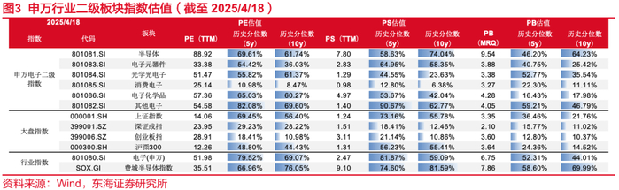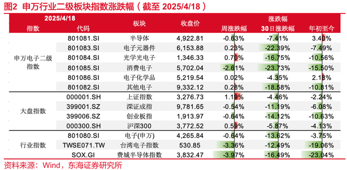 截止4月18日,申万电子二级子板块涨跌:半导体(-0.63%)、电子元器件(+0.23%)、光学光电子(+0.70%)、消费电子(-2.61%)、电子化学品(+0.02%)、其他电子(+0.23%)。海外方面,台湾电子指数下跌3.36%,费城半导体指数下跌3.97%。