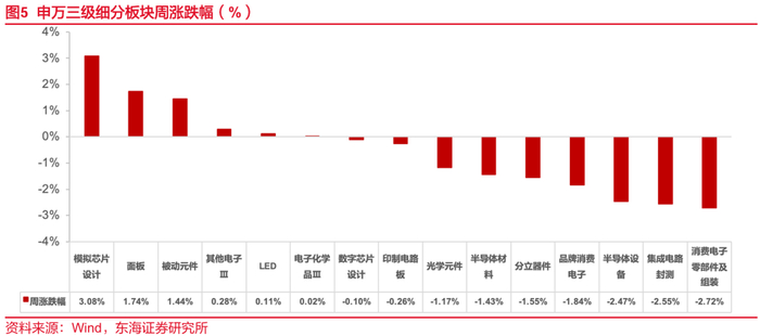 本周半导体细分板块涨跌幅分别为:品牌消费电子(-1.84%)、消费电子零部件及组装(-2.72%)、半导体设备(-2.47%)、面板(+1.74%)、被动元件(+1.44%)、LED(0.11%)、数字芯片设计(-0.10%)、模拟芯片设计(+3.08%)、印制电路板(-0.26%)、电子化学品Ⅲ(+0.02%)、光学元件(-1.17%)、半导体材料(-1.43%)、其他电子Ⅲ(+0.28%)、集成电路封测(-2.55%)、分立器件(-1.55%)。
