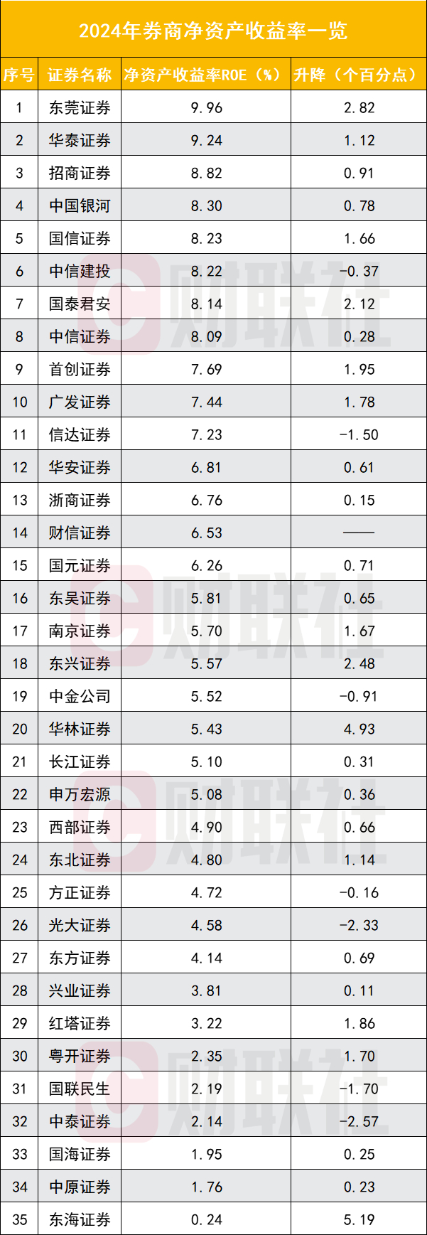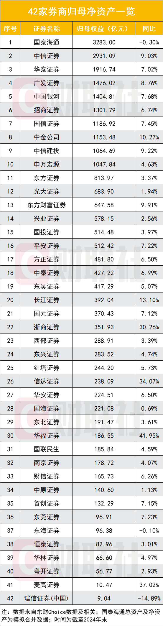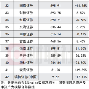 净资产下滑的3家券商为东海证券(-0.1%)、国泰海通(-0.3%)、瑞信证券(中国)(-14.89%)。