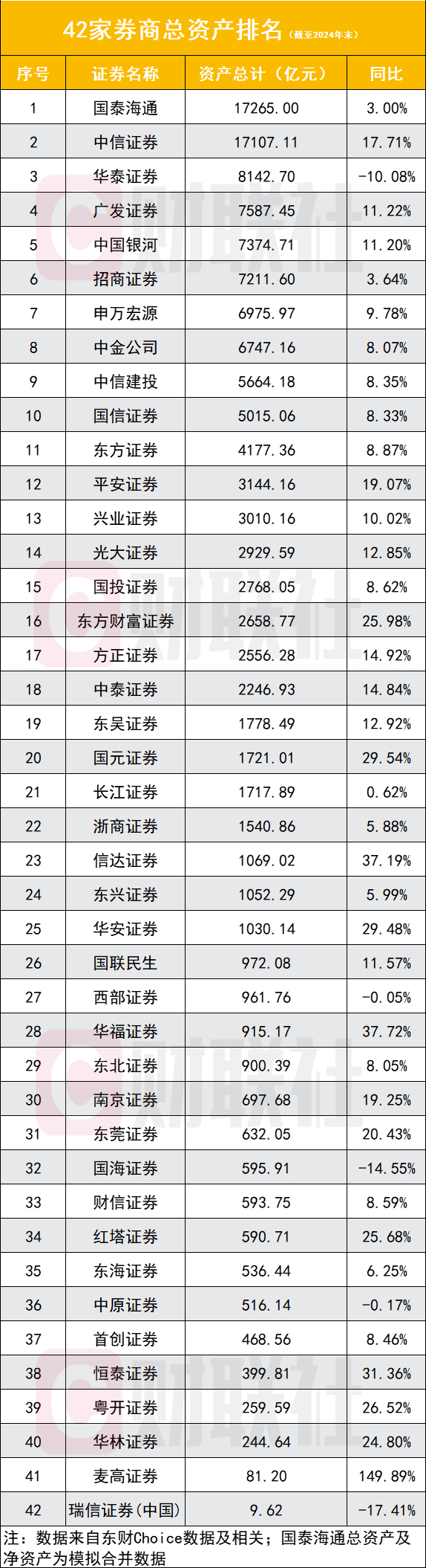 总资产排名:在42家数据可比券商中,截至2024年末,总资产排名前十券商依次是国泰海通(1.73万亿)、中信证券(1.71万亿)、华泰证券(8142.7亿元)、广发证券(7587.45亿元)、中国银河(7374.71亿元)、招商证券(7211.6亿元)、申万宏源(6975.97亿元)、中金公司(6747.16亿元)、中信建投(5664.18亿元)、国信证券(5015.06亿元)。