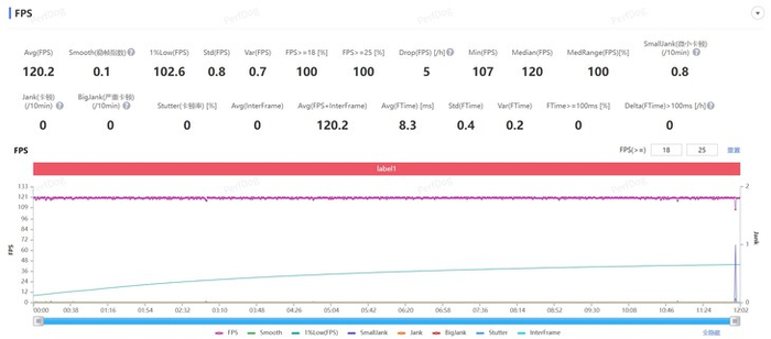 在《王者荣耀》游戏中,荣耀GT Pro可选择极高帧率和极 致画质设置,PerfDog记录显示平均帧率达到了120.2fps,在整个游戏过程中能够保持满帧率运行,可以全程享受零卡顿的游戏体验。不论是在激烈的战斗场面还是复杂的视觉效果下,都能保持稳定流畅的画面表现。