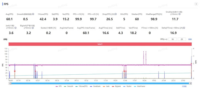 在实际的游戏体验中,我们使用荣耀GT Pro将《原神》画质调到最高,并且开启60帧率模式。通过PerfDog记录结果显示,在将近版分钟的游戏过程中平均帧率高达60.1fps。并且,在测试中,前15分钟为纳塔地区跑图场景测试,帧率可以说是非常的稳定,几乎没有任何明显波动;而后10分钟则为异色三连星的战斗场景。但从上面的测试帧率曲线来看,帧率波动也很小,几乎和跑图时一样稳定,整个游戏过程画面都非常的流畅丝滑,这样的表现无疑已经算得上十分出众了。