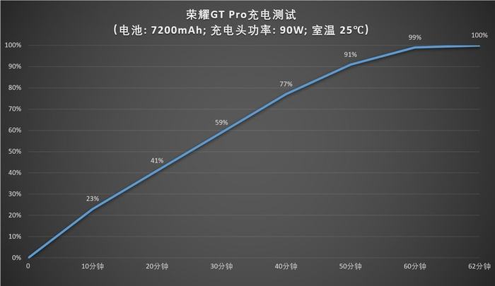 此外,荣耀GT Pro还支持90W的快速充电技术,通过快速充电可以在短时间内快速恢复电量,大大提升了用户的使用便利性。经过我们实测,10分钟可充到23%,半小时就能充到59%,而充满这块大电池需要62分钟左右。考虑到这款手机的超强续航时长,每两天花1个多小时充电,其实就能满足使用需要了,日常轻度使用两天一充也完全没有问题。