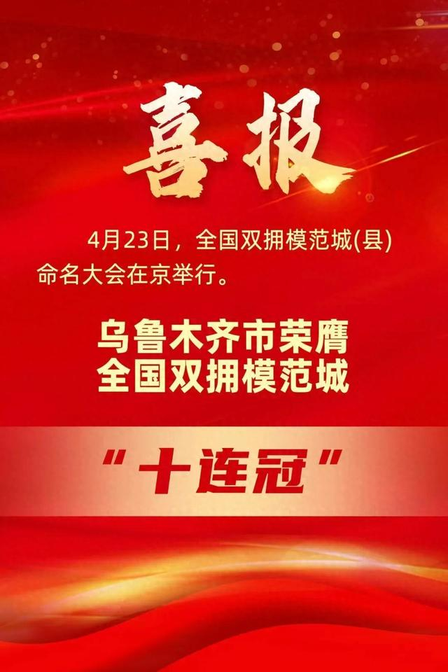 乌鲁木齐晚报全媒体讯(记者贾梦妍 宋建华 王丽娜 迪丽娜尔·加力肯)4月23日,全国双拥模范城(县)命名大会在京召开。乌鲁木齐市再次荣膺 "全国双拥模范城"称号,成功实现全国双拥模范城"十连冠"。