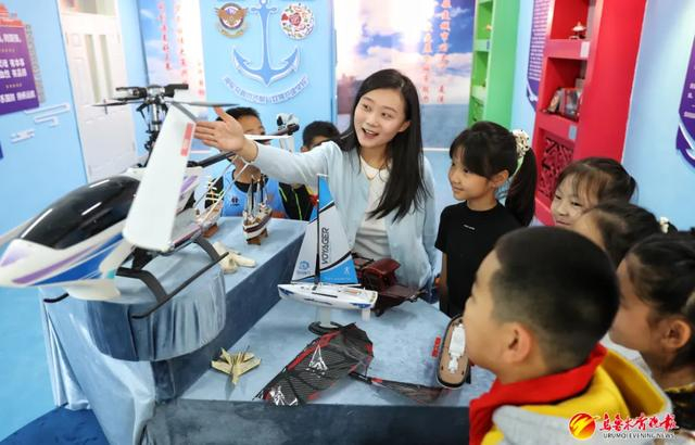 4月23日,在乌鲁木齐市双拥模范学校市第22小学,三年级(4)班的同学们在老师崔迪的带领下参观学校海防角。