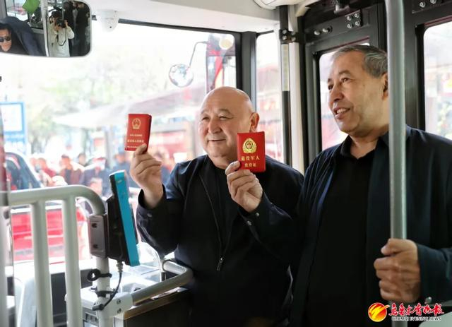 4月23日,退役军人加力肯·托呼塔森(左)、托合塔尔别克·巴克尔阿洪出示退役军人优待证免费乘坐公交车。