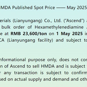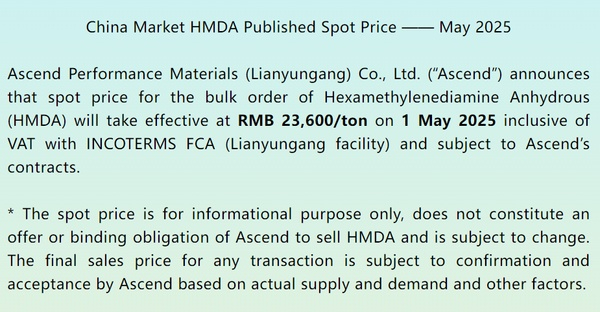 4月20日,奥升德功能材料(连云港)有限公司宣布 2025 年 5 月 1 日起己二胺(HMDA)散水的现货价格按照人民币23,600元/吨执行。此价格包括了增值税,并且仅适用于按照国际贸易术语解释通则FCA(连云港工厂)条款和从属于奥升德的合同。5月份己二胺相比4月,每吨涨价2000元,价格波动也折射出全球供应链的紧张态势。