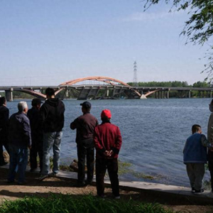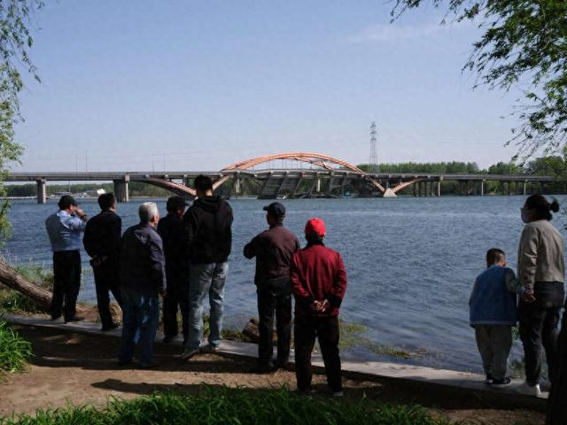 4月23日,北京市顺义区潮白河畔,民众围观受损坍塌的潮白河大桥。当日早晨,潮白河大桥发生火情,部分桥体受损坍塌。交通、消防、交管等部门和属地政府第一时间赶赴现场,组织开展灭火、交通管制等处置工作,现场未发现人员伤亡。中青报·中青网记者 李隽辉/摄