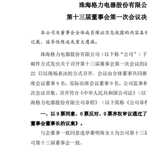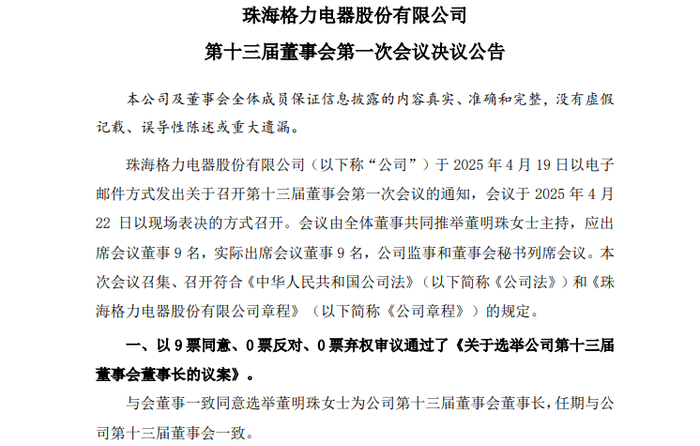 4月23日,格力电器(000651)发布换届公告,董明珠全票当选,继续担任公司董事长一职。