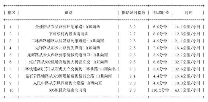 昆明道路拥堵排行榜top10: