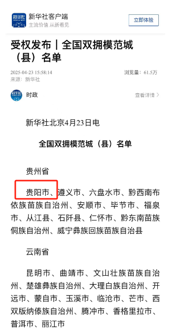 4月23日,全国双拥模范城(县)命名大会在京召开。大会宣读了关于命名全国双拥模范城(县)的决定,并为全国双拥模范城(县)代表颁奖,贵阳市位列其中。据悉,这是贵阳市连续第九次获评“全国双拥模范城”。