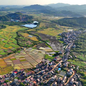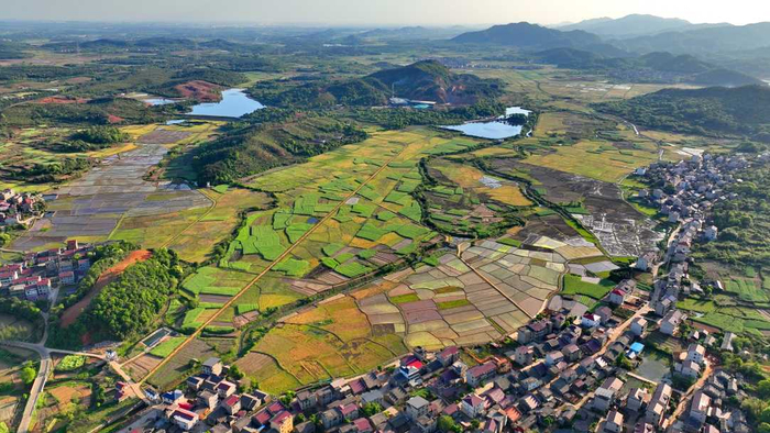 4月21日,江西省丰城市隍城镇青山村,农田与灌渠、乡村民宅、田间小路交织相衬,构成一幅色彩斑斓的晚春田园画卷。