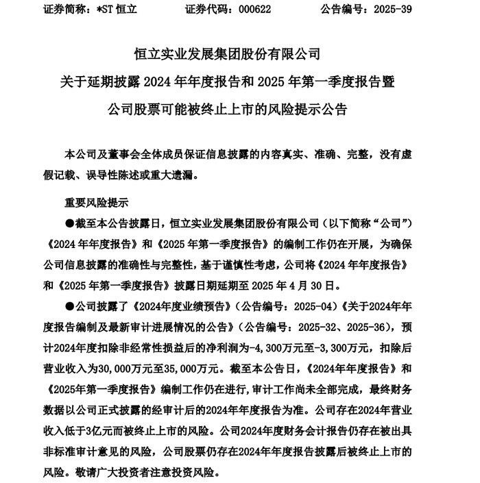 *ST恒立:延期披露2024年年度报告和2025年第一季度报告
