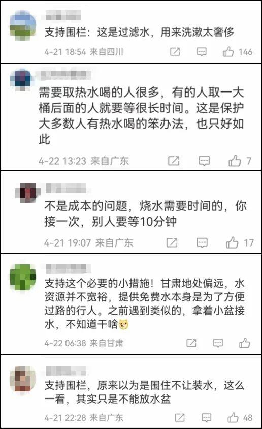 同时,也有网友对此表示支持:“支持围栏:这是过滤水,用来洗漱太奢侈。”“需要取热水喝的人很多,有的人取一大桶后面的人就要等很长时间。”
