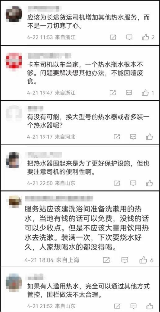 对此,有网友表示,“应该为长途货运司机增加其他热水服务,而不是一刀切寒了心。”“如果有人滥用热水,完全可以通过其他方式管控,围栏做法不太合理。”