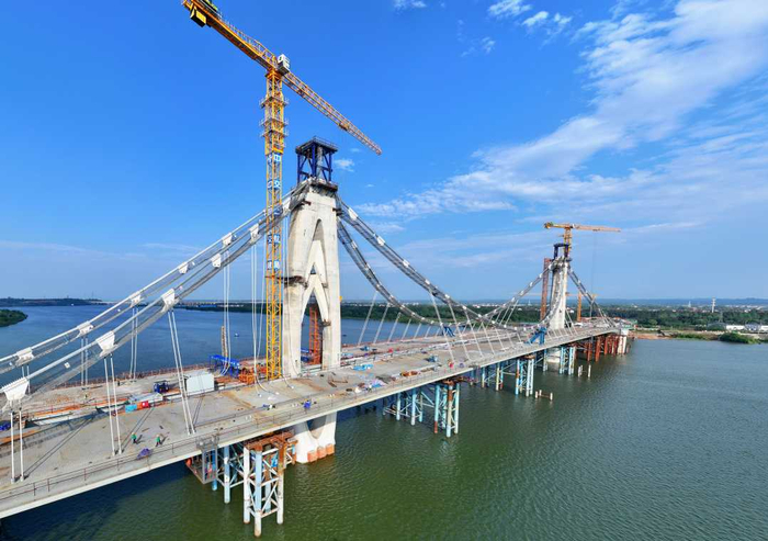 4月21日,江西省吉安市泰和县澄江大桥项目正在进行吊索施工。
