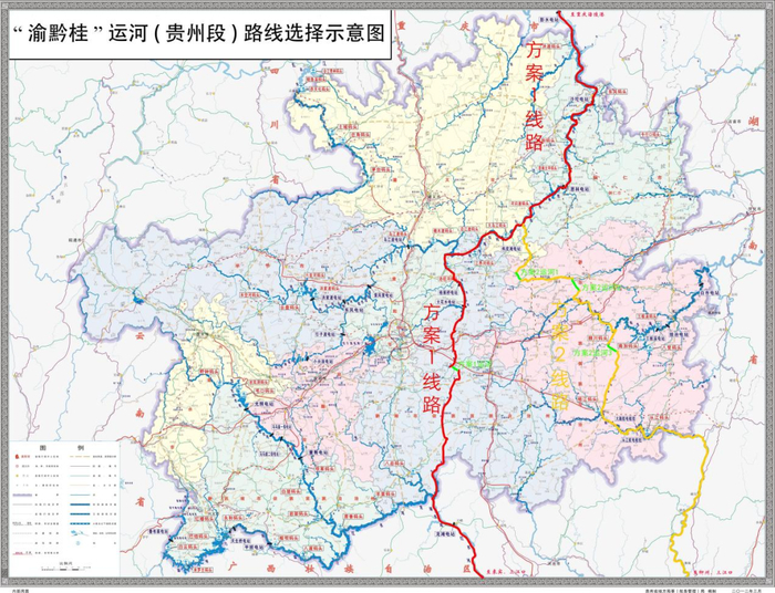 (图)红色线路为“渝黔桂”运河贵州段众多备选方案之一,离省会贵阳最近。