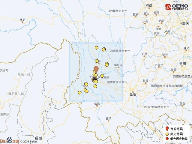 历史地震:根据中国地震台网速报目录,震中周边200公里内近5年来发生3级以上地震共112次,最大地震是2021年5月21日在云南大理州漾濞县发生的6.4级地震(距离本次震中68公里),按震级大小前50次历史地震分布如图。