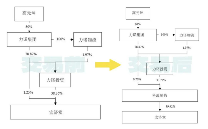 本次交易前后,宏济堂的控股股东均为力诺投资,实际控制人均为高元坤,控制权不会发生变更。