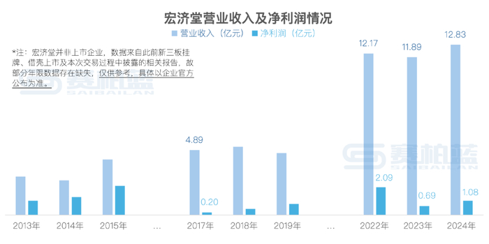 近年来,宏济堂营收水平明显增长,相比于欲借壳上市时5亿元上下的收入,宏济堂近三年营收均已超过11亿元;不过,其净利润水平并不稳定,2015年一度达到2.21亿元,2017年又降至0.2亿元,2023年宏济堂净利润下降六成以上,2024年有所回升。