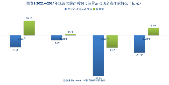 Wind数据显示,2021—2024年,江波龙的经营活动现金流净额分别为-8.11亿元、-3.26亿元、-27.98亿元、-11.90亿元,累计净流出51.25亿元。同期,该公司的净利润分别为10.13亿元、0.73亿元、-8.37亿元、5.05亿元,净现比分别为-0.80倍、-4.48倍、3.34倍、-2.35倍。