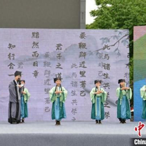 中新网怀化4月23日电(瞿云 欧文琪)“杖藜一过虎溪头,喝出僧房问惠休。云起峰间沉阁影,林疏地底见江流……”4月23日,在湖南沅陵县龙舟文化广场,身着传统服饰的沅陵鹤鸣山小学学生以诵、吟、武相结合的形式演绎《虎溪书韵》,“书香少年”的蓬勃朝气展露无遗。