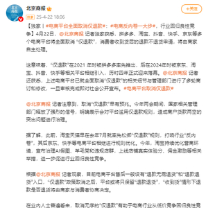 这意味着,“仅退款”在2021年时被拼多多率先推出,后在2024年时被京东、淘宝、抖音、快手等相关平台相继引入,历时四年正式迎来落幕。记者还获悉,上述电商平台已就全面取消“仅退款”的相关细节与管理部门进行了多轮商讨和修改,一旦审核完成即对社会公开宣布。