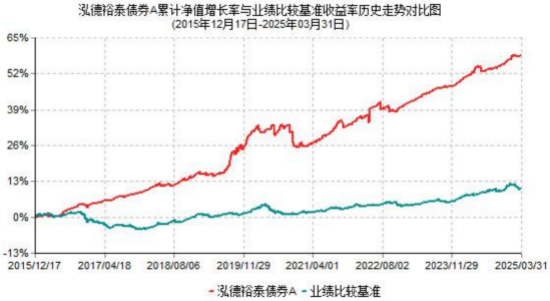 2025年一季度泓德裕泰债券A基金净值增长率为0.75%,同期业绩比较基准收益率为-1.19%。基金自2015年12月17日成立以来累计净值增长率58.56%,同期业绩比较基准收益率为10.39%。
